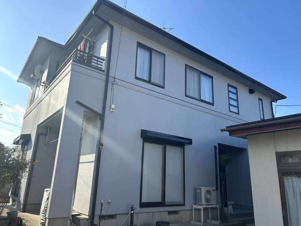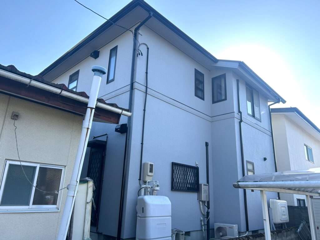 クラックの大きい部分にはVカット処理を施したうえでシーリング材で補修し、その後に外壁へ吹付仕上げを行い、既存と同じようなパターンを再現しました。これにより、補修跡が外壁になじみ、クラックが目立ちにくい仕上がりとなるよう納めています。こうした「塗る前のひと手間」をしっかり行うことで、仕上がりの美しさと塗装の持ちに違いが出てきます。
