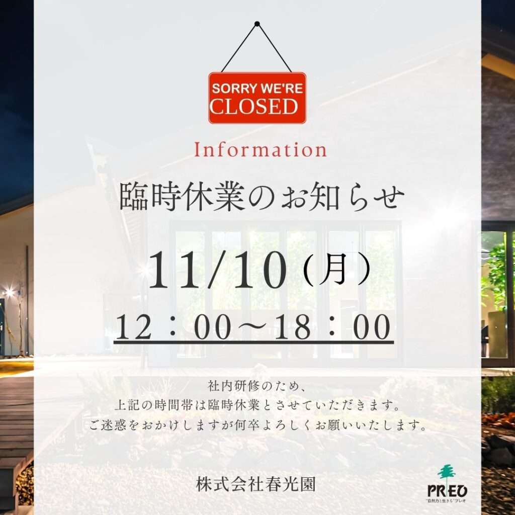 11/10(月)PM臨時休業のお知らせ