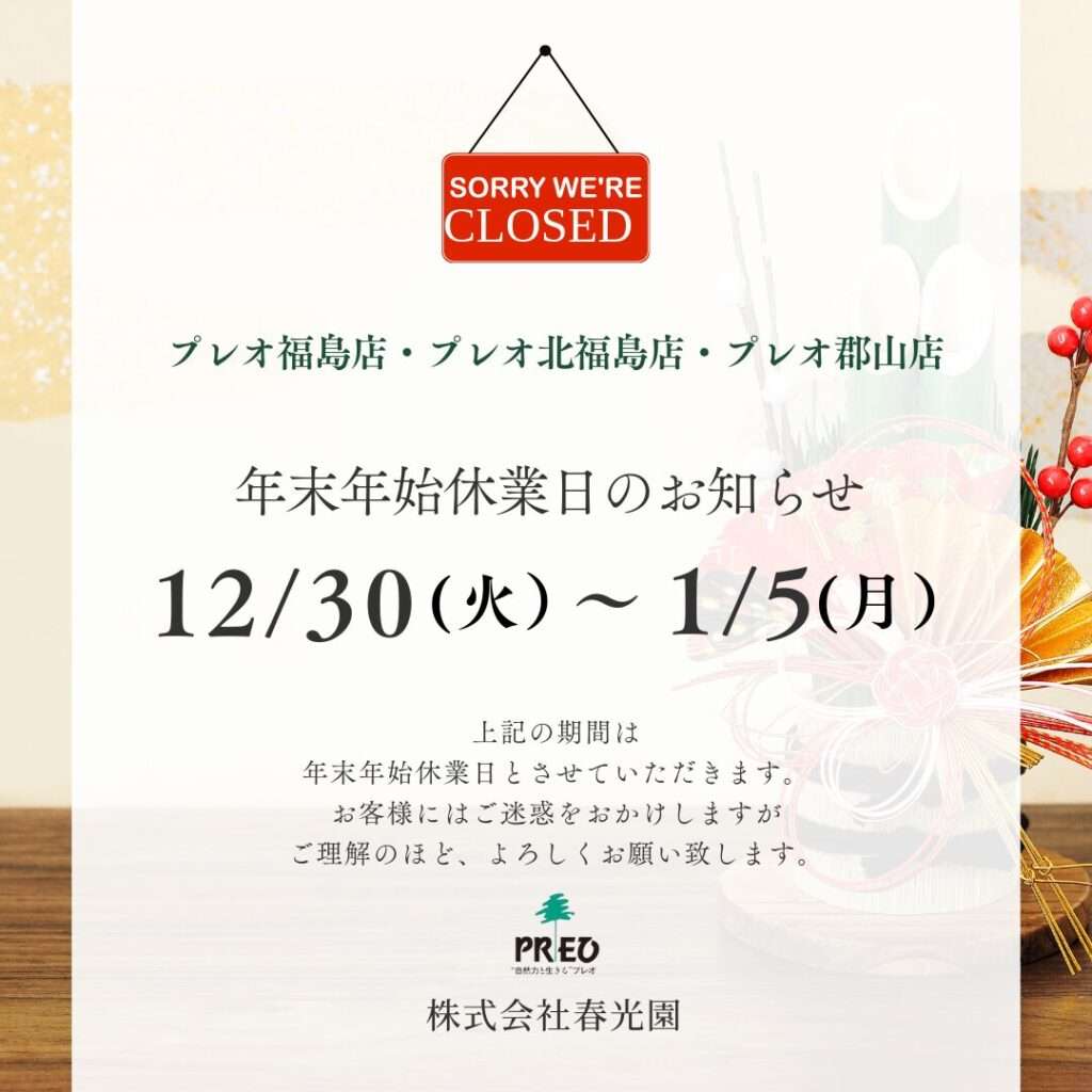 上記期間中は、プレオ福島店・プレオ北福島店・プレオ郡山店ともに、店頭でのご対応ならびに各種業務をお休みさせていただきます。休業期間中にいただいたお問い合わせにつきましては、2026年1月6日(火)以降、順次ご対応させていただきます。